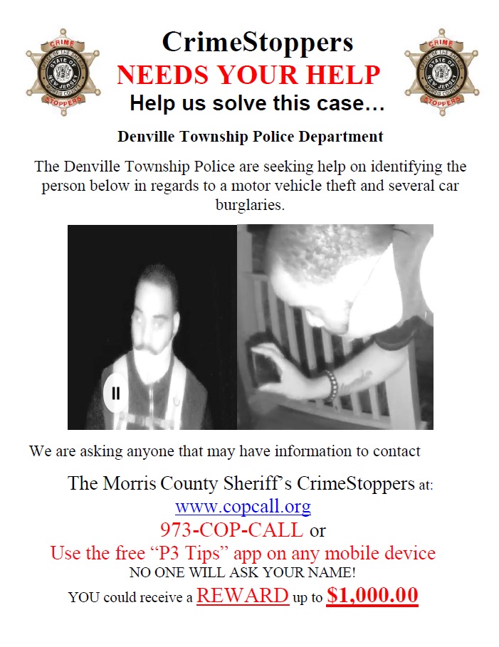 The Denville Police Department is investigating a recent string of motor vehicle burglaries in the Township. In addition, several surrounding towns are also investigating motor vehicle burglaries which may be related. As part of the investigation, video surveillance was obtained of a possible suspect. These motor vehicle burglaries have been identified as the Morris County Crime Stoppers Crime of the Week (see attached flyer). Anyone who can identify the suspect in the photographs is asked to contact Morris County Crime Stoppers at 973-Cop-Call. Information leading to an arrest may result in a reward of up to $1,000.